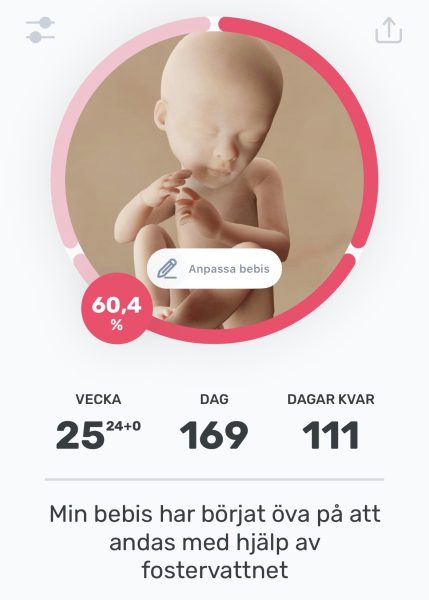 Magen växer, det syns inte så mycket på bilderna men i verkligheten märks det. Magen har börjat krypa uppåt. Lillen har varit väldigt aktiv i magen också, det är mysigt. Även jag har fått känna henne sparka.